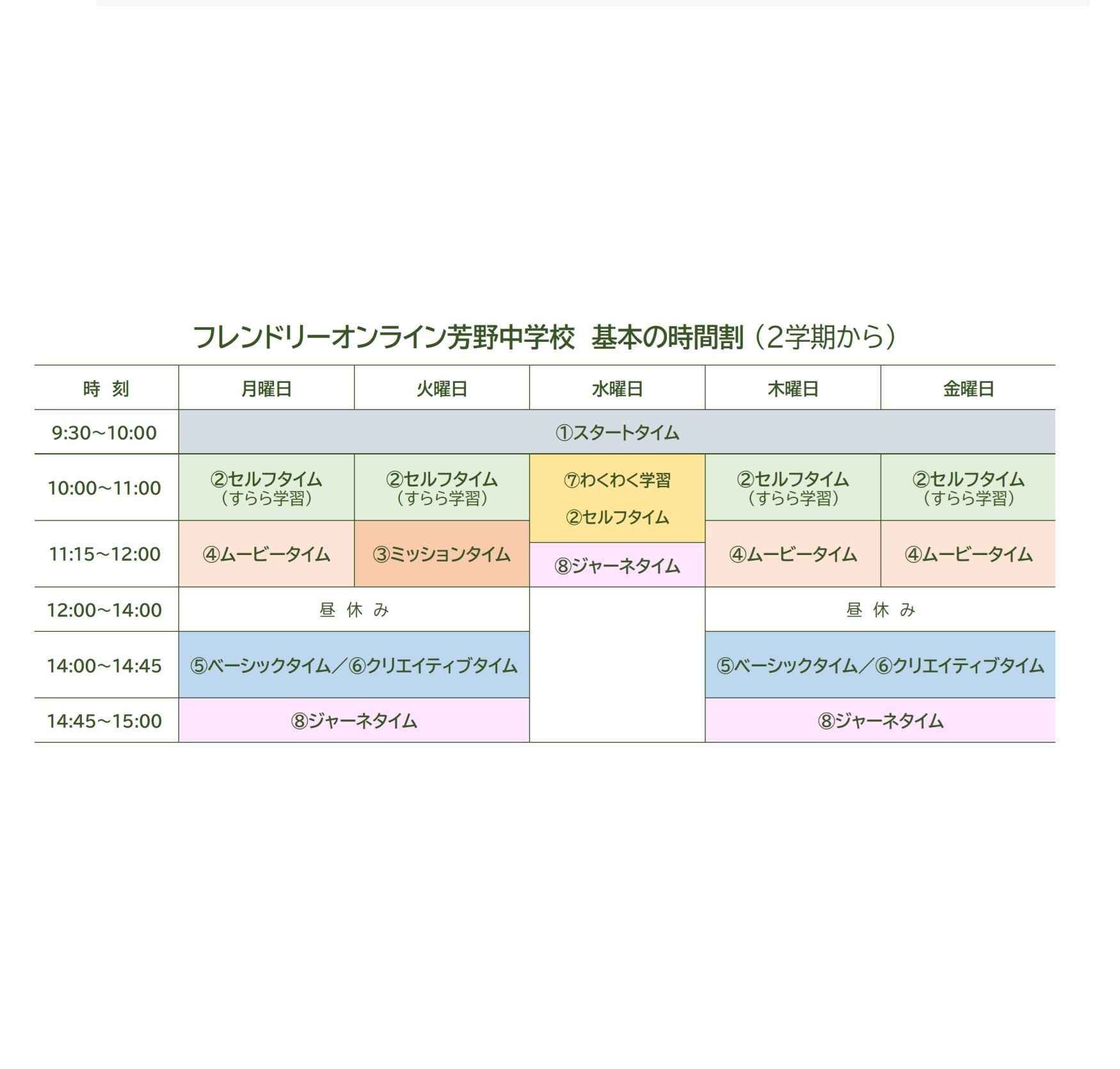 時間割は、基本的に始まりのホームルームである「スタートタイム」に始まり、座学や体験型学習などの教育活動、さらに1日の終わりを「ジャーネタイム」というホームルームで締める、という流れになっている。