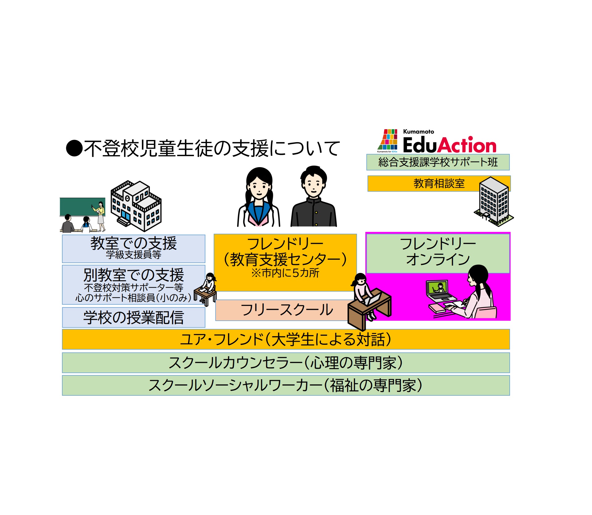 従来から熊本市では、不登校の児童生徒に対する支援を幅広く行うとともに、学校内外の公的な支援のみならず市内の民間のフリースクールまで、積極的に紹介してきた。そして、これらと併せて、学校外の、教育支援センターによる支援の一環として2021年9月に「体験」という形で導入されたのがオンライン型の支援である。