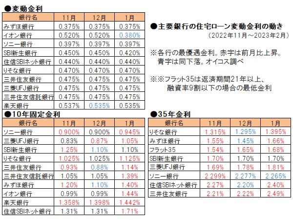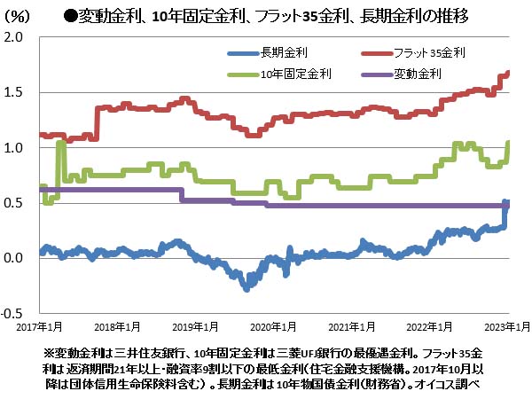 一方、上昇基調となっているのが10年固定金利と35年固定金利だ。いずれも2022年にロシアによるウクライナ侵攻に伴う物流の混乱や原油価格の高騰などを背景に欧米で物価上昇が進み、3月には米連邦準備制度理事会(FRB)による利上げが始まったことが金利上昇のきっかけとなった。その後は夏から秋にかけて金利上昇がいったん収まったものの、12月20日に日銀が突如として金融緩和の縮小を発表したことで長期金利が急上昇し、連動して固定期間が長めの住宅ローン金利も上昇に転じた形だ。