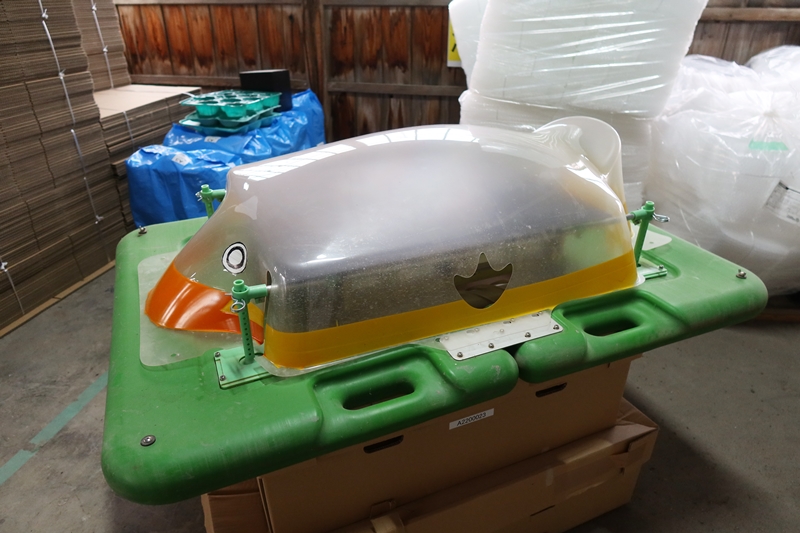 野菜の集荷施設でアイガモロボの実物にお目にかかったが、本体は推進装置、水を濁らせる細長いスクリューがセットされたシンプルな四角いもので、そこにアイガモを模した透明のプラスチックケースが別売りでセットされる。