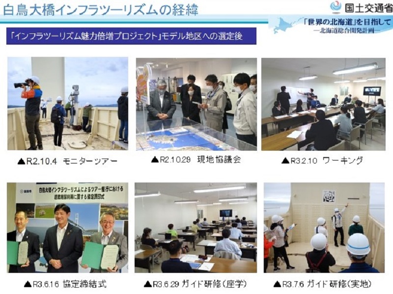 東日本最大の吊り橋で、日本で初めて積雪寒冷地に建設された北海道室蘭市の「白鳥大橋」もツアーが実施されているインフラの1つ。室蘭市長の提案をきっかけに管理者である同省北海道開発局が検討に乗り出し、地域による実施体制を整え、地元の企業がクルーズ船を運航している。室蘭市を含む周辺の3市4町は「西胆振」地域と呼ばれ、著名な温泉地やアイヌ文化を発信する国立施設、港湾クルーズが人気の室蘭港、室蘭の「工場夜景」などとの周遊観光が期待されている。