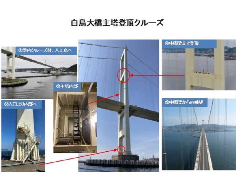 白鳥大橋は2020年、国土交通省の「インフラツーリズム魅力倍増プロジェクト」のモデル地区に選定され、以前はできなかった主塔に登頂できる、地域主体のツアー商品の開催につながった。360度の絶景のパノラマを楽しめるコンテンツとして売り出している。