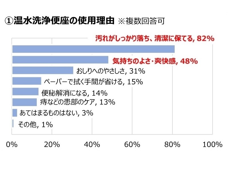 日本レストルーム工業会が2022年に行った温水洗浄便座利用者を対象とした意識調査によると、温水洗浄便座の使用理由としては、「汚れがしっかり落ち、清潔に保てる」が82%と最も多く、「気持ちのよさ、爽快感」が48%と、「清潔・気持ちよく使える」ことが利用する主な理由となっている。初めて使用した時の感想では、「くすぐったい」「なんとも言えない感覚」という声もあるが、「気持ちいい・爽快・快適」と感じる方が51%と最も多い。