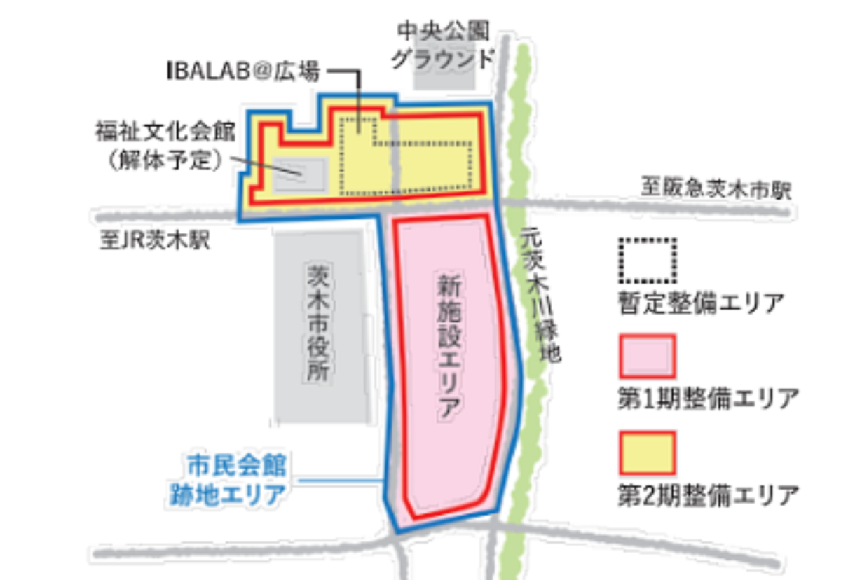 もともと、おにクルの企画の発端は市民会館の閉館にある。現在おにクルの建設現場を挟んだ向かい側にある「IBALAB(イバラボ)@広場」には、耐震性などを理由に2015年12月に閉館した元市民会館があった。茨木市では、この「IBALAB@広場」やおにクル建設現場など、元市民会館周辺のエリア一体を「市民会館跡地エリア」として、2019年から整備を行ってきた。