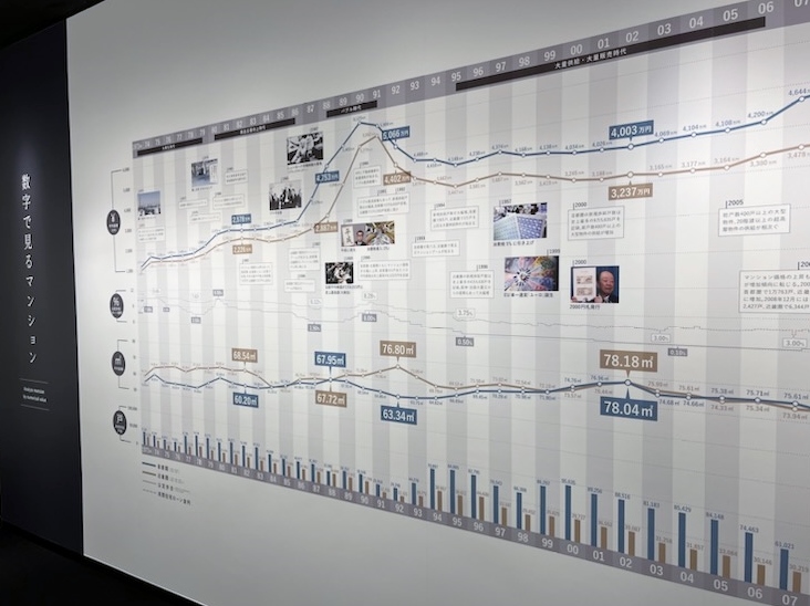 また、壁には数字で見るマンションということで、首都圏と近畿圏の新築分譲マンション平均価格、平均面積、年間供給戸数、民間住宅ローン金利など、1973年~2021年の48年間の推移のデータがグラフ化されている。これだけでもとても貴重な資料である。まさに、マンションの歴史を時系列で見ることができる、見ごたえたっぷりの展示である。