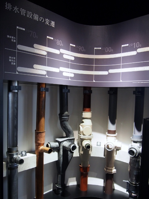 排水管の変遷のコーナーでは、かつての配管の模型が展示されている。最新のサイホン排水方式では、床下のパイプに傾斜を付ける必要がなくなったので、リフォームなどの際に水回りが動かしやすくなっているという。こういう技術が、間取りの進化や暮らしやすさにつながっていくのだ。