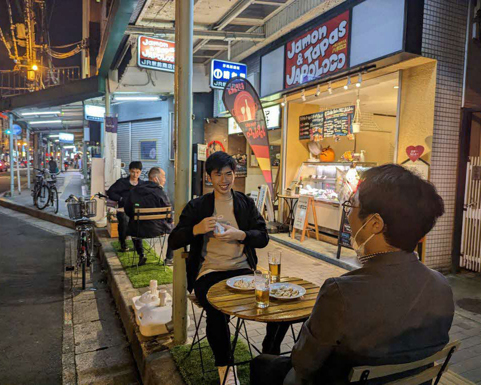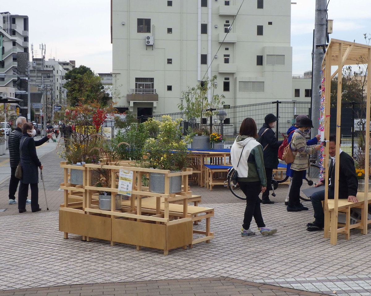 2022年11月3〜30日の約1ヶ月間、中央通りと東西通りで行われた社会実験は、茨木市と沿道事業者が主催した。JR駅前商店街では、椅子やテーブルを置くことで、沿道飲食店の賑わいが屋外へ滲みだす仕掛けを施した。一方、おにクルの北側や阪急茨木市駅の南側ではウッドデッキや植栽を設置したり、通り沿いにベンチを置いたりなど、休憩空間を用意した。82店舗と多くの事業者とともに実施し、スマホを利用したデジタルスタンプラリーなども実施することで、来訪者の回遊を促した。