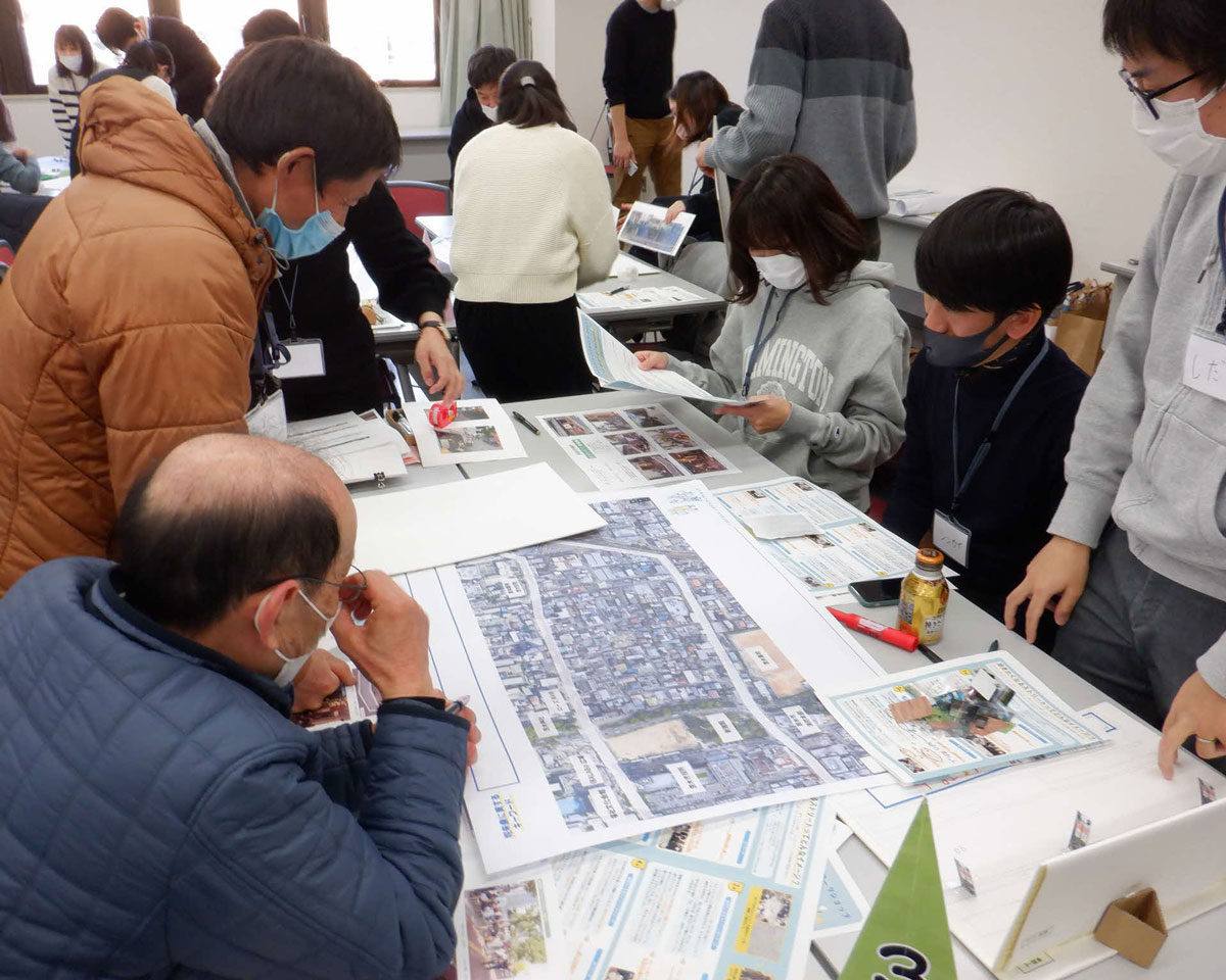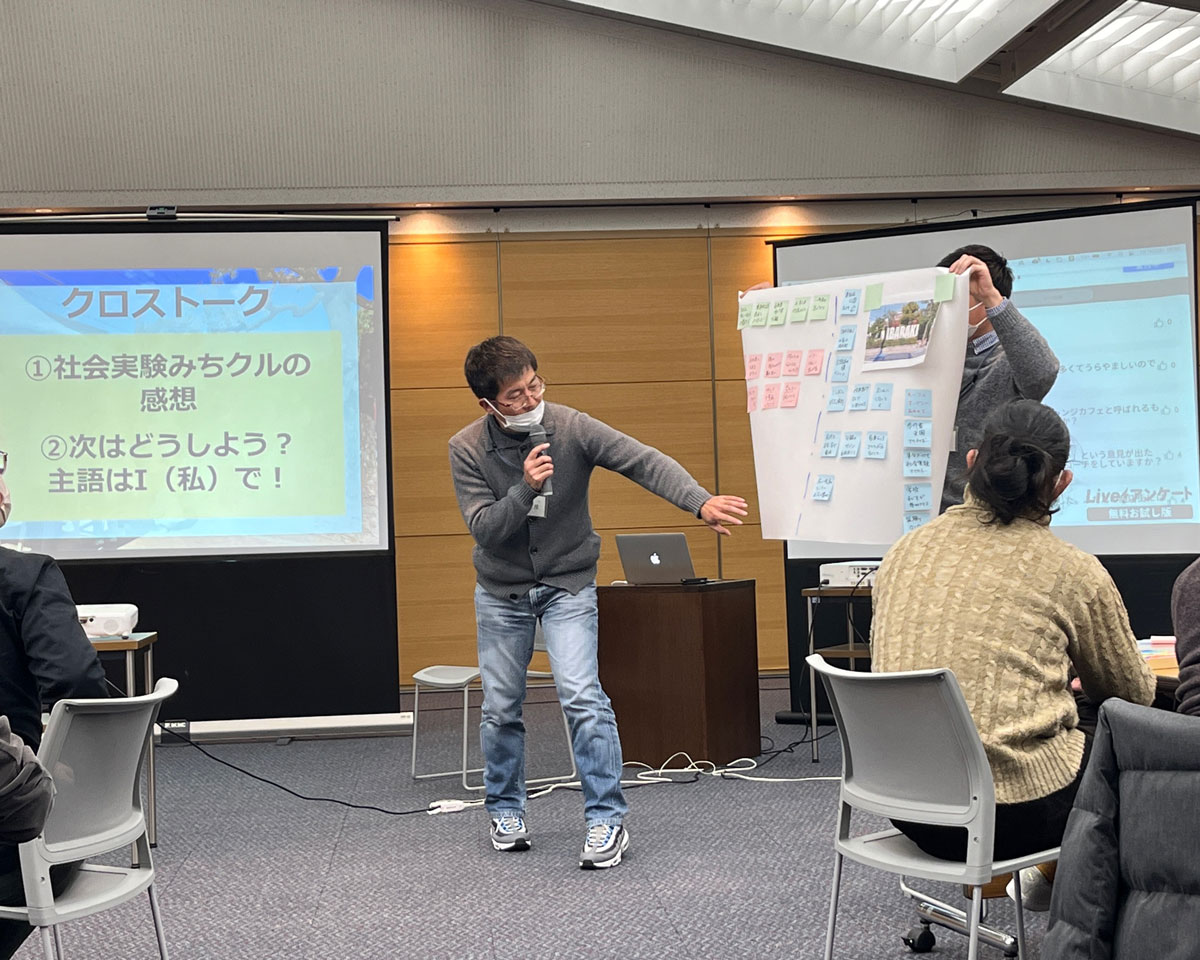 2023年1月15日には、社会実験の検証結果を報告する、市民参加型のイベント「みちから、まちを、動かそう!」が開催された。参加者は約30名。当日は、JR吹田駅周辺で進められているまちづくりの具体的事例も紹介された。実際に暮らすまちで飲食店を経営しながらまちづくりを行っているゲストスピーカーの話に、参加者も聞き入っていた。グループに分かれたクロストークの場面では、市民と行政が混じり合って沿道の活性化やまちづくりへの積極的な意見交換がなされていた。記念撮影をしたくなるような茨木市のシンボルマークの設置提案や歩行者天国の要望など、市民からさまざまなアイデアが生まれていた。丁寧な対話の場が繰り返されることで、市民が自分ごととしてとらえるようになり、提案がどんどん具体化している様子がうかがえた。