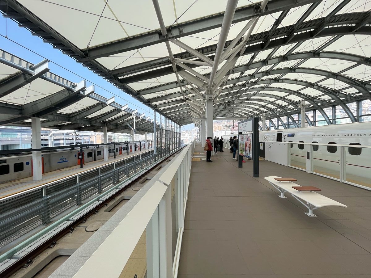 長崎駅は終着駅であり始発駅でもある、世界的にも類を見ない「港に面する頭端駅」だ。特徴的なのは、新幹線と在来線2つの駅舎の屋根が連続するようにデザインされ、遮蔽物がないことから新幹線と在来線がホームに平行に並んでいる姿が見られることだ。長崎駅前では2020年に、在来線の高架化工事が完了している。高架化とは、地上の線路を橋梁(高架)に移すことで、地上の道路混雑の緩和や分断された市街地の一体化を図るものだ。