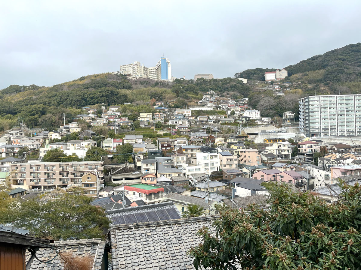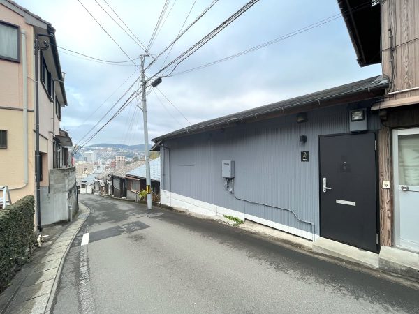瓦屋根にトタン外壁という長屋群は、道路向かいの住宅と見た目ではそう変わらない。「ここも住宅なのでは?」と思うくらい、周囲の風景になじんでいる。坂道を振り返ると眼下に広がる長崎中心部の風景。思いのほか、高い場所まで上ってきたことがわかる。