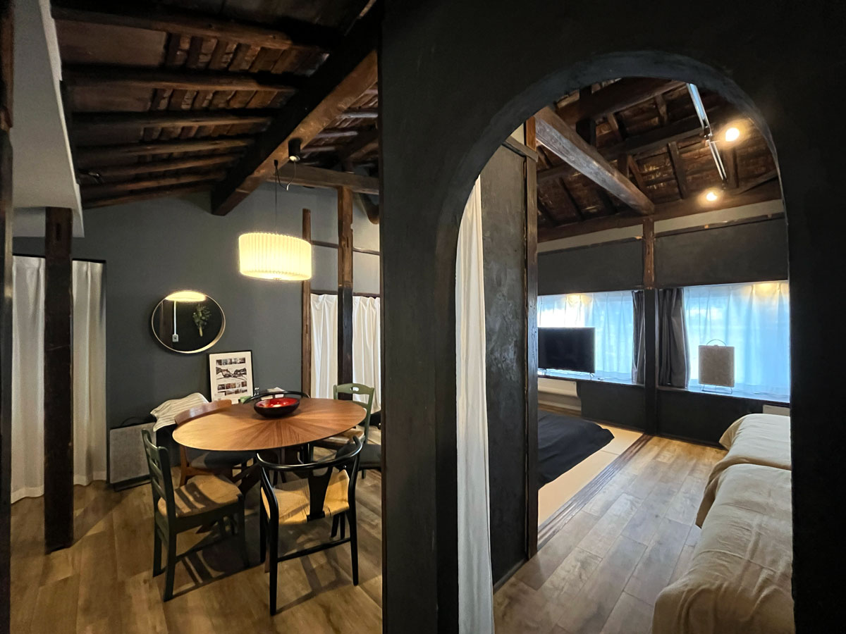 ドアを開けるとスタイリッシュな空間が目の前に広がる。外観と内観のギャップも魅力の一つかもしれない。「長崎坂宿ひとま」は、一人旅、出張やワーケーション、カップルなどの利用を想定して作られた間取りで、ベッドとしても利用できるソファも配置されている。「長崎坂宿ゲスト」は、大人数収容可能で、友人同士のグループ旅行や家族の利用を想定した内装で、天井の梁に木造長屋の面影が感じられる。