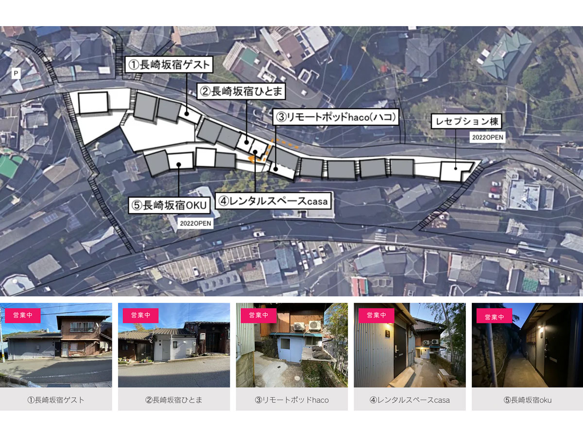 そんな場所に「長崎坂宿(さかやど)」はある。長崎駅を降りて、道路の真ん中を走るちんちん電車(長崎電気軌道)に揺られて、まちの風景を眺めながら、思案橋駅まで。山の方に向かって坂を10分ほど上り、息が弾んできたころに木造長屋群が見えてくる。宿泊施設「長崎坂宿」(ゲスト・ひとま・OKU)が3軒、「レンタルスペースcasa」とテレワーク専用スペースの「リモートポッドhaco」が1軒ずつ並んでいる。