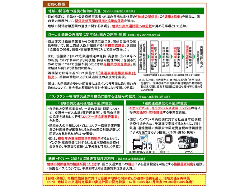 閣議決定された改正案の主旨は、簡単にいうと「国の積極的な関与を強める」という内容となっている。従来の自治体と鉄道事業者の2社の協議では、自治体側が路線の存続を希望し、鉄道事業者側が赤字路線の廃線を希望するケースが多かったため、議論が存続か廃線かの二者択一に陥りがちであった。両者の隔たりは大きく、円滑な議論が進みにくいということが課題となっていた。