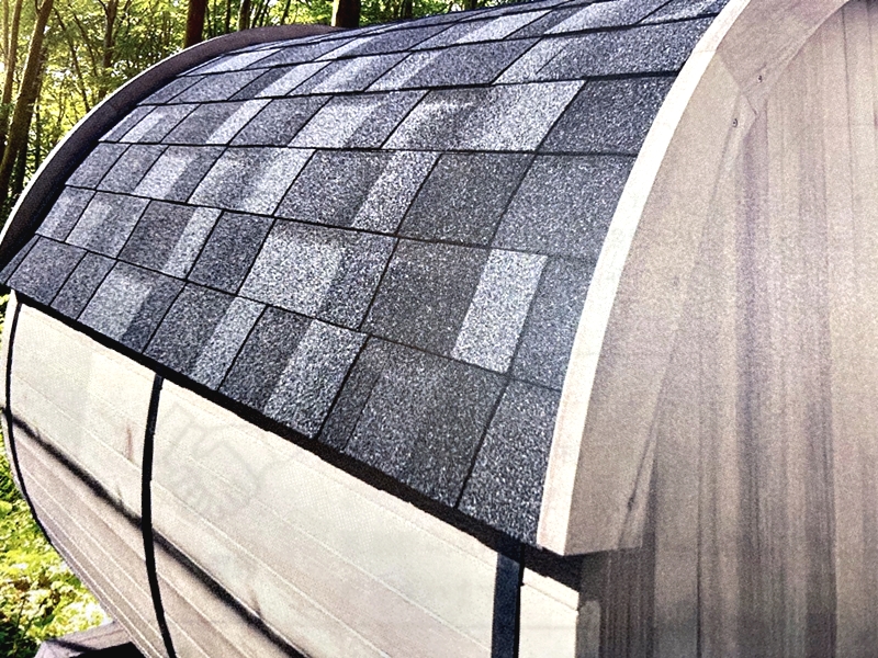 バレルサウナの屋根部分にシート状のアスファルトシングルを装着することで、屋外使用にも対応。屋外に設置する場合、雨風などの対策は欠かせない。アスファルトシングルは軽量で柔らかく、ひび割れやさびが発生しにくいという特徴があり、防水・防音性にも優れている。屋根材の下には防水シートやコーキングも施し、万全の対策を施しているとのことだ。