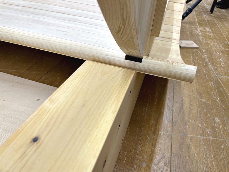 半日ほどで組み立てが可能。土台やベンチ、スノコ、扉の一部にはビス止めしている箇所があるものの、木材の接合部分には木栓を使用しており、釘を使わないためさびにも強い。基本的には設置場所に部材を持ち込んで職人が組み立てる。