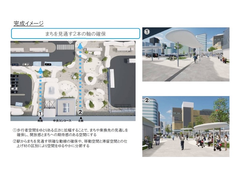 隣接するまちとの連携もデザインに取り込まれている。現在の広場は、地下鉄・地下街への階段や交番などがあることも関係していると思うが、駅前に広がるまち全体をパッと見渡しにくい。そのため、駅のコンコースからの2ヶ所ある出口から真っすぐにまちを見通すことができる2本の軸の確保を予定。ゆとりある歩行者空間とともに、植栽する樹木を東西方向の同一軸線上に配置して、駅とまちとの直進性を出す計画だ。
