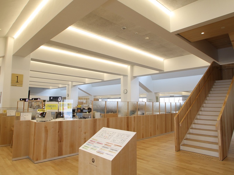 町民窓口は1階に集約され、見通しがよく開放感のある空間だ。2階には町長室や災害対策室などが入り、3階は議会やイベントに使われる「町民ホール」やフリースペースがあった。