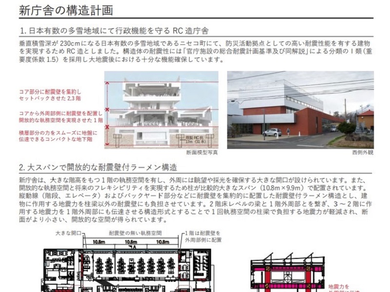 2021年3月に竣工した新庁舎は高い耐震性能があるRC造で、地下1階、地上3階建て。延べ床面積は約3,300m2。外観上の最大の特徴は、1階屋根の積雪と2階の窓の干渉を避けるために中央が盛り上がった「凸型」の断面形状だ。