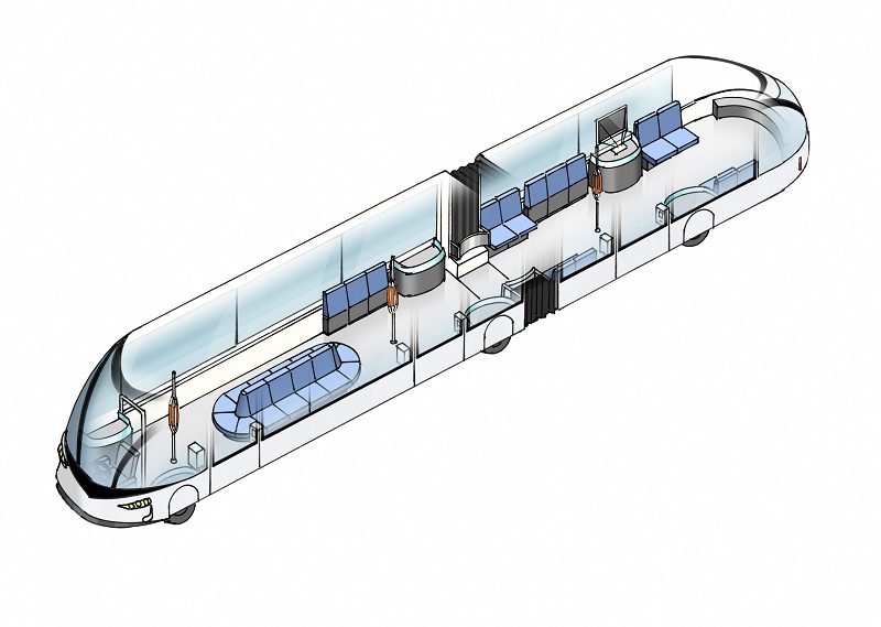 車内空間は、車いすやベビーカーの使用も含めて誰もが快適に過ごせるように、フラットでゆとりのあるものに。座席は、空間確保にもなる折りたたみ式のものも設置する一方、立ち乗り用の背もたれもあるといいのではと考えられている。景色を楽しめる大きな窓、運行状況やまちの情報を提供する案内システムの備えも。