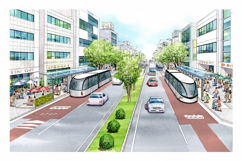 2段落目でご紹介した名古屋市の基幹バスレーンの色づけと似たイメージだ。走行レーンは、他の路線バスと共有するだけでなく、タクシーの走行、自転車の車道走行との調整も考えていくとしている。