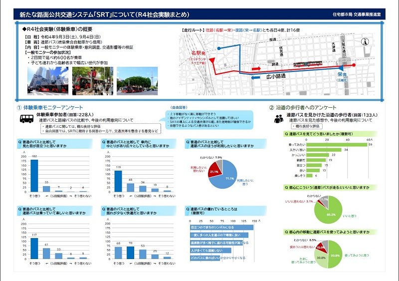 SRTでは、輸送力がアップする連節のスタイル、または単車車両による隊列走行を検討中だ。今回は隣の岐阜県で実際に使われている岐阜乗合自動車の連節バスを借用した。体験乗車アンケートでは、普通のバスと比べて、見た目の目立ち具合、楽しさ、車内のゆとりという3つの質問で、「そう思う」から「そう思わない」までの5段階のうち「そう思う」が最も多い結果に。おおむね良好な評価を得た。自由回答では、「街のアイデンティティやシンボルとして活躍してほしい」という声がある一方、「SRTの導入による交通渋滞が心配、また定時制が確保できるか」と懸念する意見も上がった。