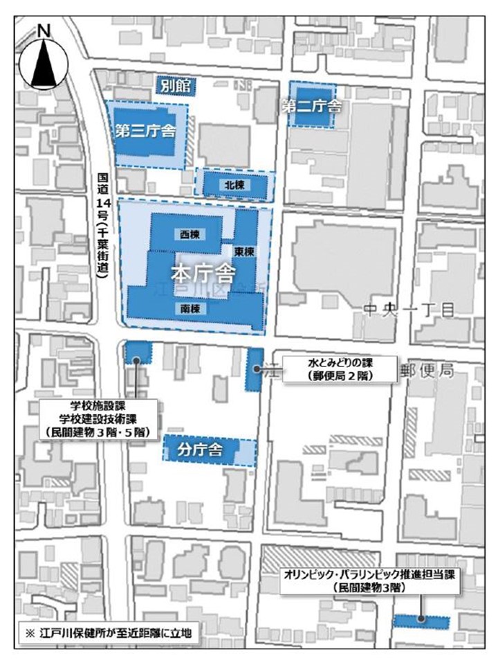 現庁舎があるのは、江戸川区中央一丁目。JR総武線「新小岩駅」よりバスで10分、都営新宿線「船堀駅」よりバスで15分と、けっして交通の便はよくない。また1962年に本庁舎南棟を建設して以来、行政事務の拡大に伴って増築を重ね、さらには第三庁舎や別館は周辺の民間建物を賃借して対応している。