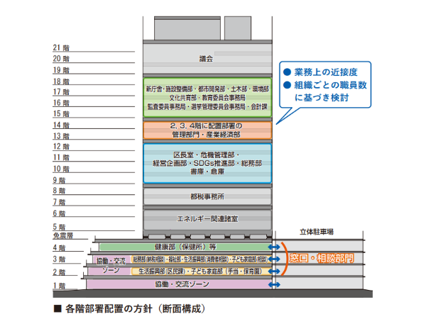 窓口・相談機能においては、2階をライフステージ・転出入など来庁者の多い手続きに対応した窓口とし、3階は個別ブースを主体として来庁者の要件に応じて職員がブースに出向く形をとる。また、近年ICT環境が目覚ましく進展していることから、将来の「来庁せずに手続きが行える区役所」を目指し、時代の変化に対応できる庁舎とする。