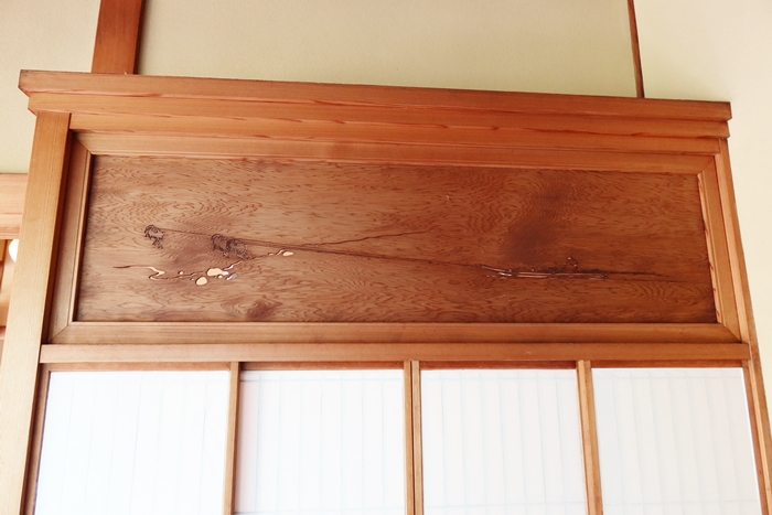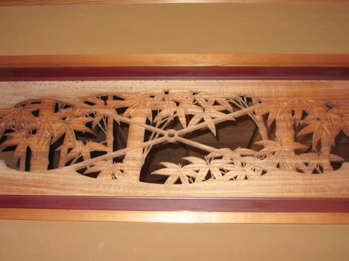 個人的には1階大広間付書院の欄間の、木目、自然にできてしまったひび割れ、穴などを上手に利用した彫刻の見立てぶりに感動した。普通なら穴が開いた材など使えないと思うところを、それを上手に取り込み、いかにも自然な風情に仕立ててあるのである。職人技とはこのことだ。
