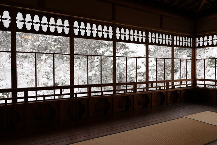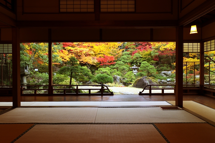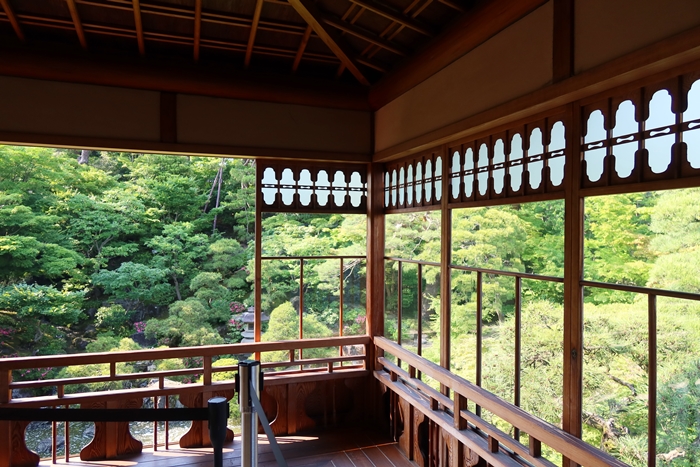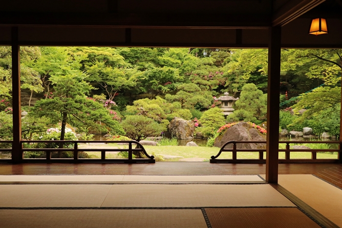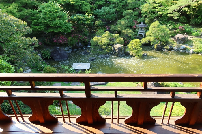 同じ大広間内でも座る場所によって庭の印象が変わるのも面白いところ。玄関近くから眺めると建物が額縁の役割を果たすのか、絵画的に見え、庭の高低も感じられるが、縁側近くから眺めると視界全部が庭となり、緑の中にいるように思えるのである。
