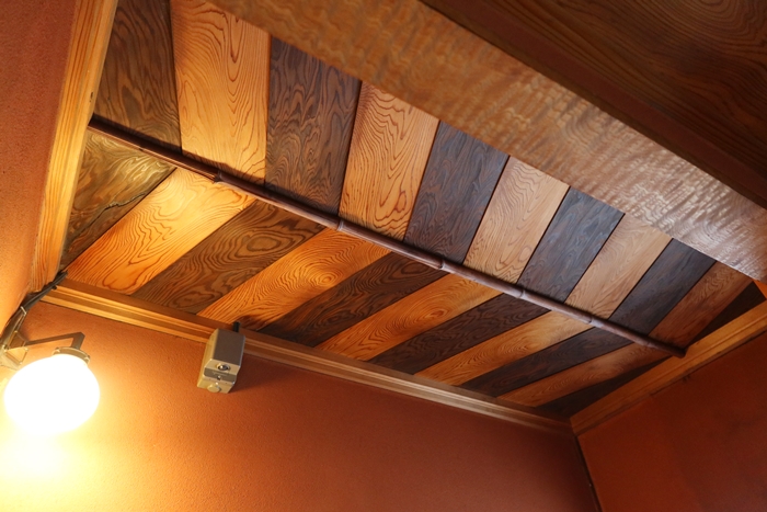 「2階、茶室の床柱には杉の虫食皮付丸太が使われているのですが、この縮れたような虫食いに出会うまでどれだけの材を見たかと考えると、気が遠くなります。しかも、それを茶室でもっともメインとなる床柱に配する。一見、すごく見えないものが実はという感覚は羽裏にこだわる粋さに通じるところかもしれません」