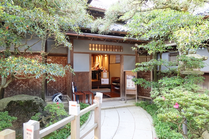 では、実際に見学していこう。門をくぐると玄関までの間には御影石を敷き詰めたアプローチがあり、主玄関を入った辺りから正面に庭が見えてくる。まっすぐ進むと廊下を挟んだところに大広間があり、ここから見る庭は圧倒的だ。