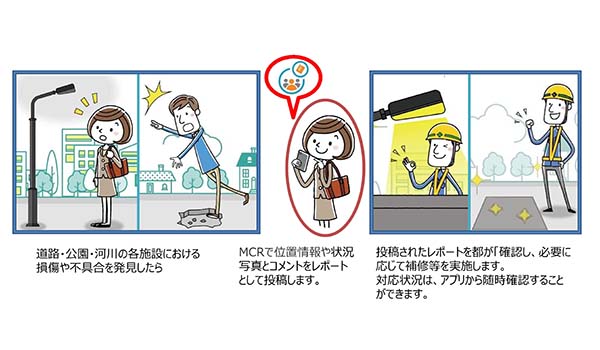 このような状況を打破する可能性があるICT(情報通信技術:Information and Communication Technology)として、My City Reportがある。My City Reportとは、スマートフォンのカメラと位置情報を利用して市民が発見した道路や河川、公園等のインフラの損傷や不具合を投稿できるシステムのことである。道路が傷んでいる、公園の遊具が壊れているといった全国のさまざまな地域で発生している街の課題を市民が自治体にレポートすることでこれらの課題を共有し、合理的、効率的に解決することを目指すシステムだ。