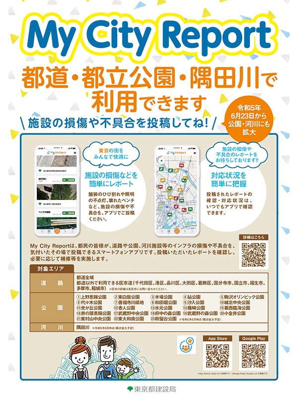 東京都では2023年6月23日からMy City Reportで都民から報告できる不具合の範囲を道路だけではなく公園と河川にも広げている。不具合を報告できる対象となっているのは、以下の都立公園と墨田川だ。