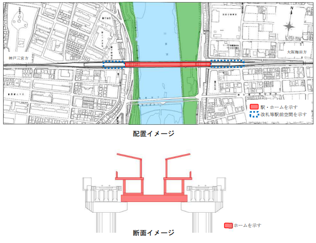 新駅のホームは2004年に改築された武庫川橋梁上に2面、つまり上下線それぞれに設置されるという。改札口は2ヶ所。武庫川をはさんで両岸にそれぞれ設け、西宮市・尼崎市それぞれの住民が利用しやすいよう考慮する。