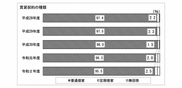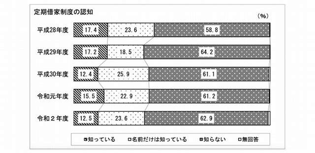 ここで、気をつける必要があることは、よく知らないままに定期借家契約で賃貸しないようにすることだ。国土交通省住宅局「令和2年度住宅市場動向調査 報告書」によると、民間賃貸住宅に住み替えた世帯の賃貸契約の種類に関し、「定期借家制度利用」 の借家は 2.5%となっており、民間賃貸住宅に住み替えた世帯における定期借家制度の認知度に関しては、「知っている」と「名前だけは知っている」の合計は 36.1%。「知らない」は 62.9%である。定期借家契約を利用する場合は、もし老後にお金がなくなったとしたら、居住する場所も含めて契約前によく考えておく必要があるだろう。