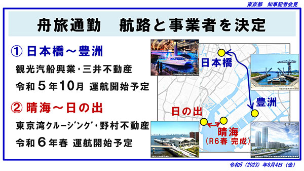 晴海~日の出ルートについては、事業者は株式会社東京湾クルージングと野村不動産株式会社である。運用されるのは、2024年春以降の予定だ。