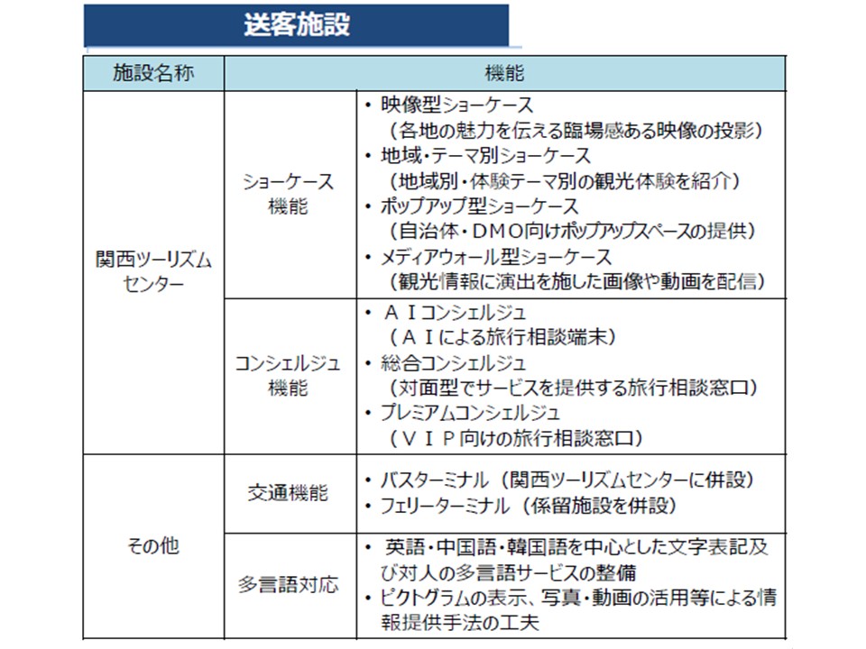 大阪IRの来訪者を、神戸や京都、奈良などの関西圏だけでなく、日本各地に観光客として送り出すための施設。関西ツーリズムセンターで、最先端技術を活用した観光情報の提供や専門人材・AIによる観光案内などを行う予定だ。また、大規模なバスターミナルやフェリーターミナルなどの、アクセス機能の整備を行い、大阪IRから日本各地に観光客を送り出していく。