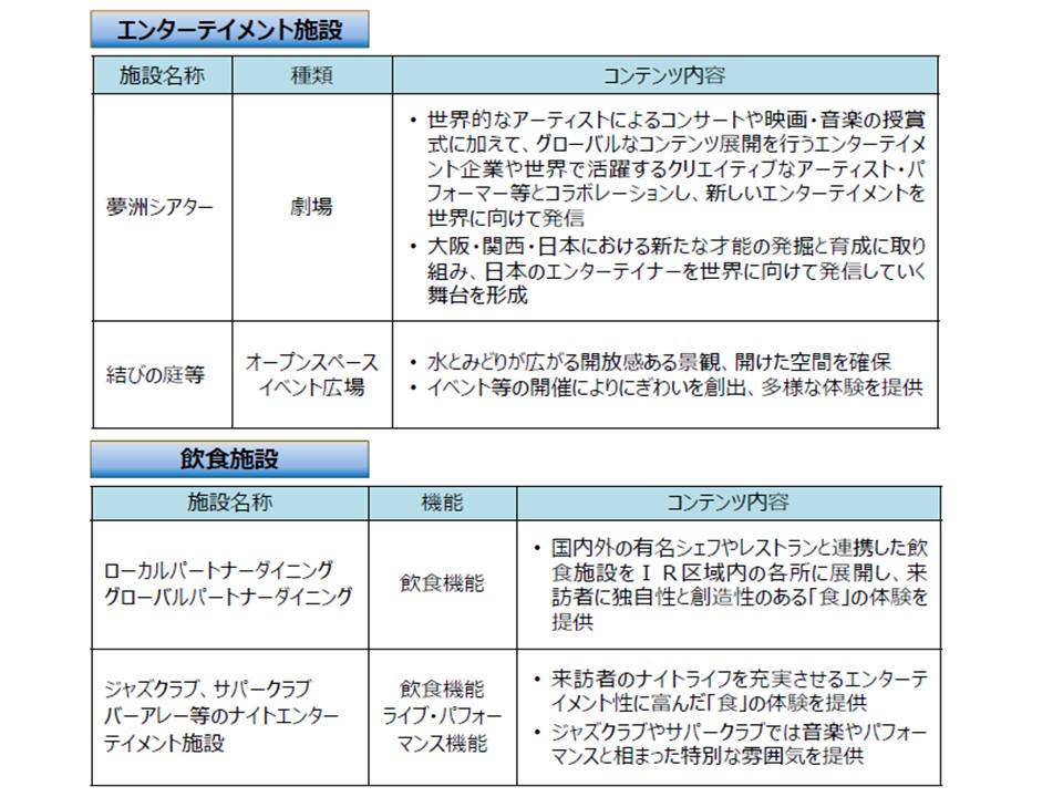 約3,500席の夢洲シアターでは、世界的なアーティストによるコンサートや映画、音楽の授賞式、大阪IRでしか見られないショーやイベントの開催など、新しいエンターテインメントを世界に発信していく。また、結びの庭などのオープンスペースでは、さまざまな体験型のイベントが提供される予定になっている。