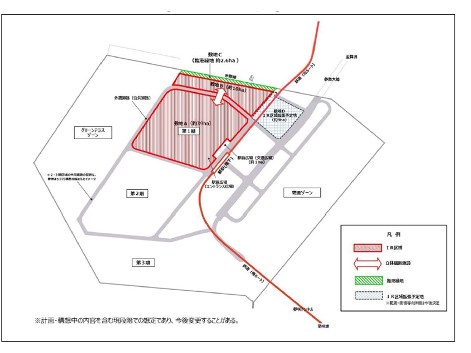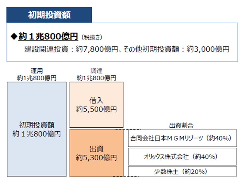 2023年4月に政府が認定した区域整備計画段階では、開業時期は2029年秋~冬ごろで、初期投資額は1兆800億円としていたが、9月に認可された計画では、開業は2030年秋ごろで初期投資額は当初計画に対して約1,900億円増の約1兆2,700億円に修正されている。