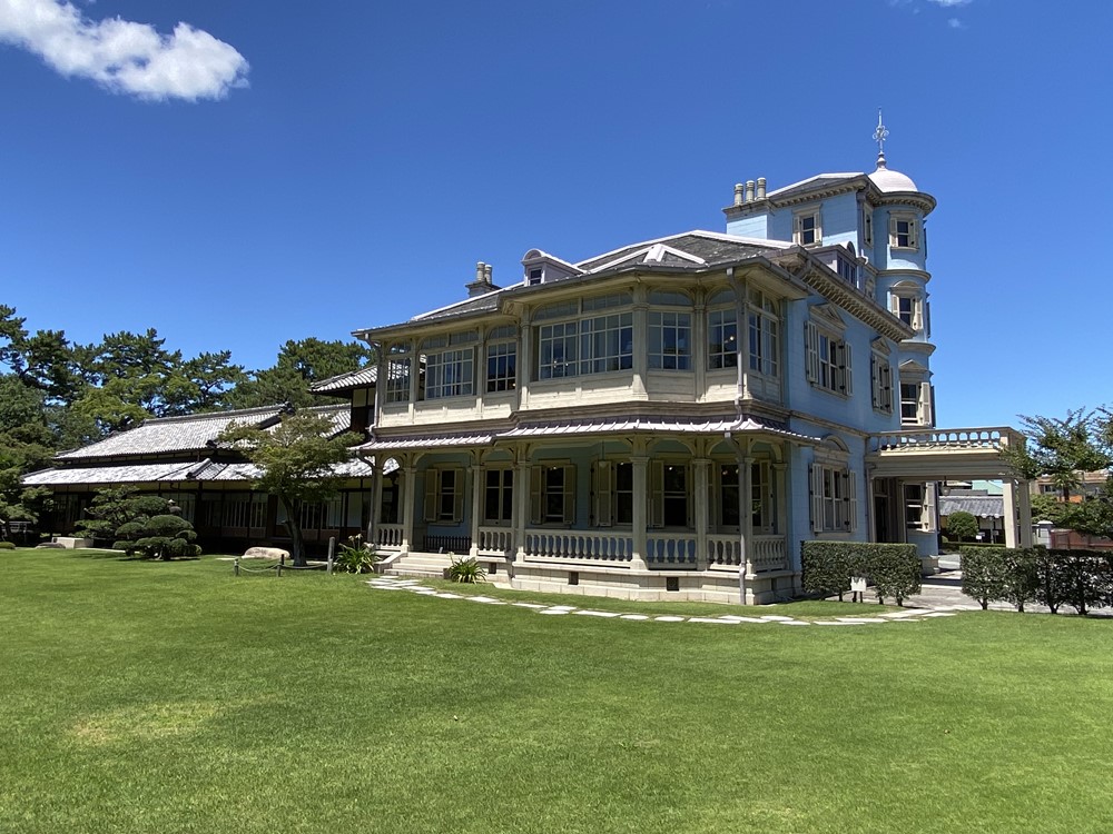 しかし、土壇場で「3階建てだと北側を流れる揖斐川(いびがわ)が見えない」ということになり、塔は4階に変更された。さすがにコンドルも頭にきたのではないかと想像するが、結果的にこの変更は、庭側(南側)から見たときの外観を魅力的にした。洋館が水色であることもあって、塔が頭、和館の平屋が尾の「鳳凰」のように見えるのだ。