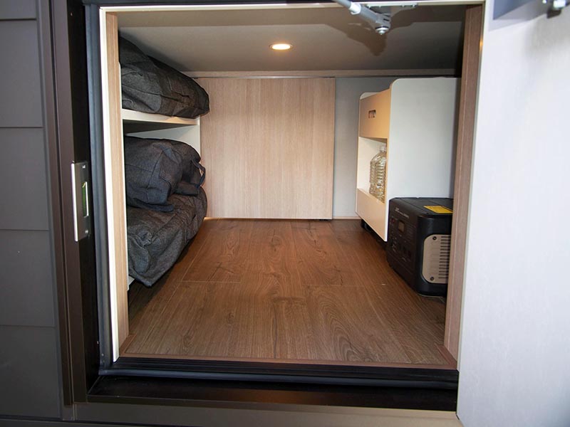 出入口を兼ねたサッシを閉じてみると外の音はほとんど聞こえない。断熱・気密性能に長けた樹脂サッシが使用されており、居住環境へのこだわりを感じた。ミサワホームの住宅「蔵のある家」を想起させる大容量な収納スペースが就寝スペースの下に設けられている。