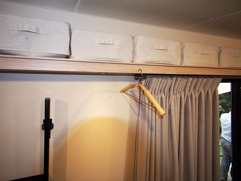 一方、応急仮設住宅を想定した「もしも」では、可変性に考慮し、張り替えが容易な床材を使用。正方形のユニットを組み合わせたソファやテーブル・ベッドなど、多様な用途で利用できる収納家具により、最小限のスペースで充実した機能を備えている。広さを調整できる可動式ベッドなど可変性に優れたオリジナル家具は、居住性にこだわるハウスメーカーとしての居住者への配慮を感じた。収納用の棚板側面には溝が彫られており、ハンガーやS字フックをかけることができる。こういった細かい部分にも長く住宅に携わる同社の心づかいがあった。