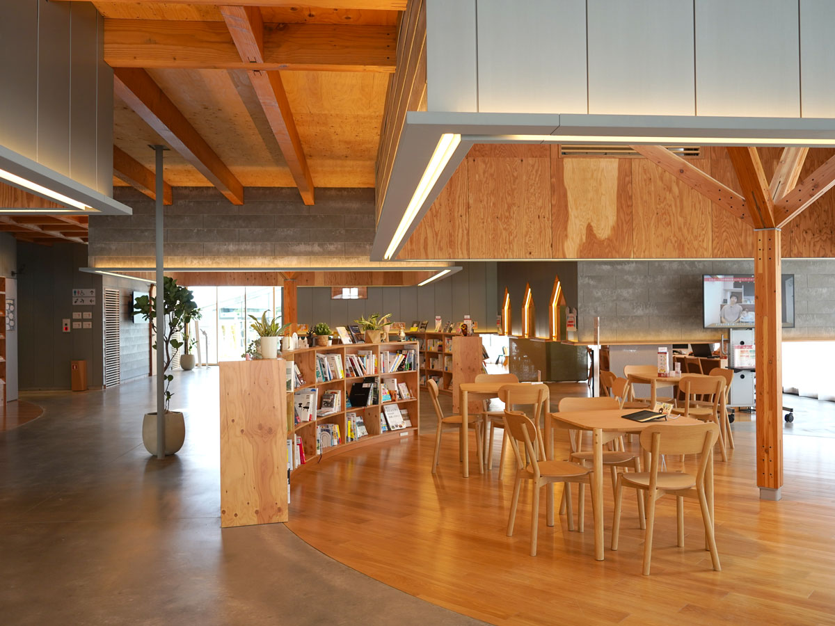 施設の中で、総合案内所としての機能を果たすのが、会場の中心に立つ「センターハウス」だ。ここには住まいづくりの相談ができるおうちカウンターや、図書コーナー、キッズコーナーが設けられている。さまざまな方向から人々を迎え入れるように表裏がなく、コロンとした多角形の平面設計となっている。建物の外周は大きく開け放てる建具として、外から地続きでどこからでも入れる土間をイメージさせる。仕切りのない室内空間には、ライブラリーコーナーや待合、ワークスペースなどの「小さなイエ」が点在する。