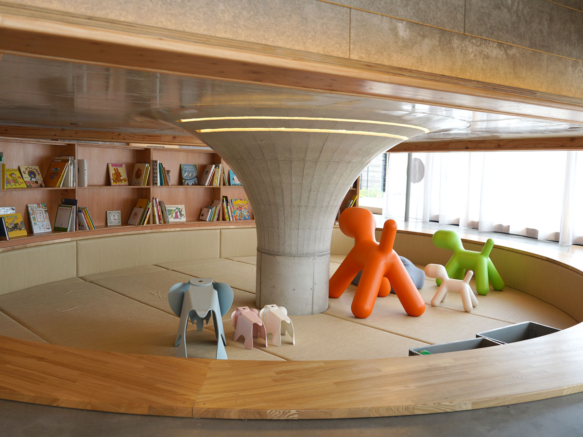 相談コーナーの「小さなイエ」は、床面を周囲の床から1m下げることで少しプライベートな空間をつくることができ、キッズコーナーの「小さなイエ」は、秘密基地のような子どもだけの居場所になる。またこの「小さなイエ」にはそれぞれ窓が付いており、自然の光や風を取り込む環境装置としても機能している。使用されている構造や素材も、高断熱サッシ・Low-Eガラス・LED照明・耐用年数が高くて再利用可能な木材など、環境に配慮されている。