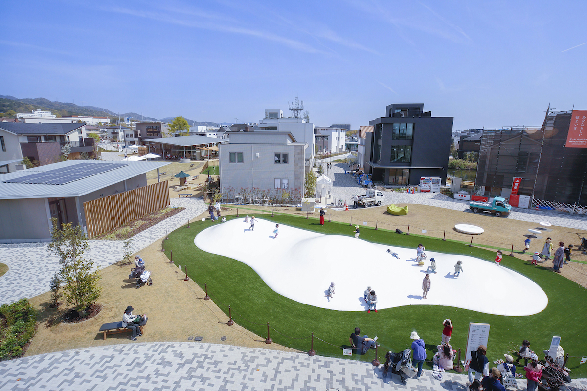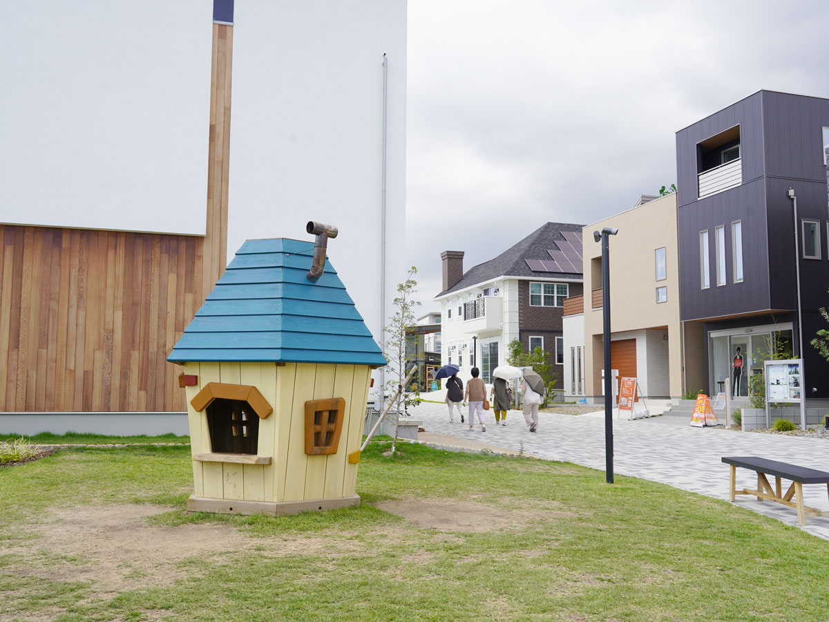 その敷地面積は4万274m2と阪神甲子園球場を上回る広さ。広い敷地内には、42軒のモデルホームが立ち並ぶだけでなく、芝生広場が広がり、大きな遊歩道の脇にはさまざまな遊具が置かれている。子どもと一緒に外遊びしたり、友達とランチをしたり、散歩のついでにモデルホームをのぞいたりできる、まるで「テーマパーク」だ。