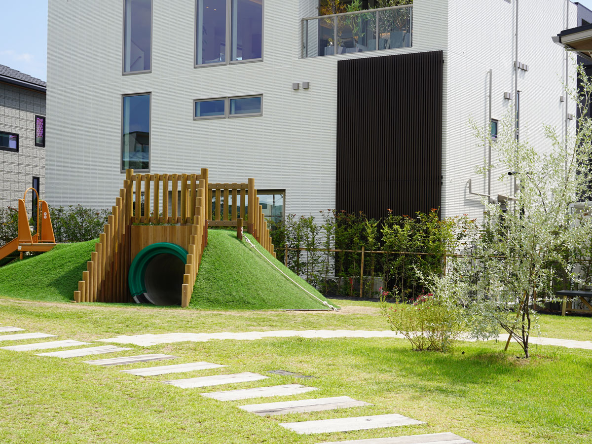 芝生が広がる公園には、子どもに人気の「ふわふわドーム」などの大型遊具やアスレチックが用意されている。また施設内のあちこちに置かれた遊具は、すべてインクルーシブデザイン。マイノリティの人々も含めたユーザーの意見を反映した、どんな子どもでも使いやすいデザインを実現している。子どもたちが思い切り遊べる空間だ。