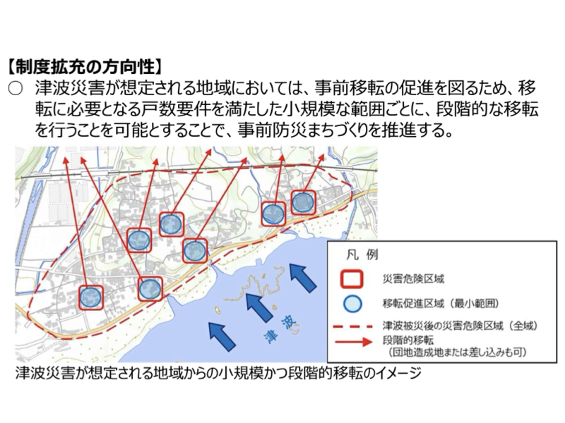 国によると、見直しの方向性としては、津波災害が想定される地域において、隣近接した5戸以上の小規模な範囲を対象とした段階的な移転を可能としたいとしている。これは、津波に対する「事前防災」を重視し、災害が発生する前に移転を推進するための見直しである。