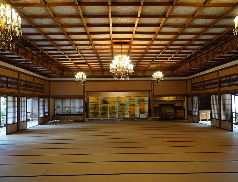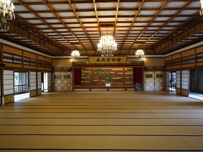 昭和初期にでき、創建当初の時代から少し進んだ職人の技が活きた「大広間」。120畳もの広さに本格的な能舞台を備え、格天井の中央部を一段高くした重厚な造りの折上格天井にシャンデリアも輝く豪華さだ。受け継がれてきた伝統的な日本建築と洋の絢爛さがあるシャンデリアが見映えよく独特の雰囲気を醸し出している。