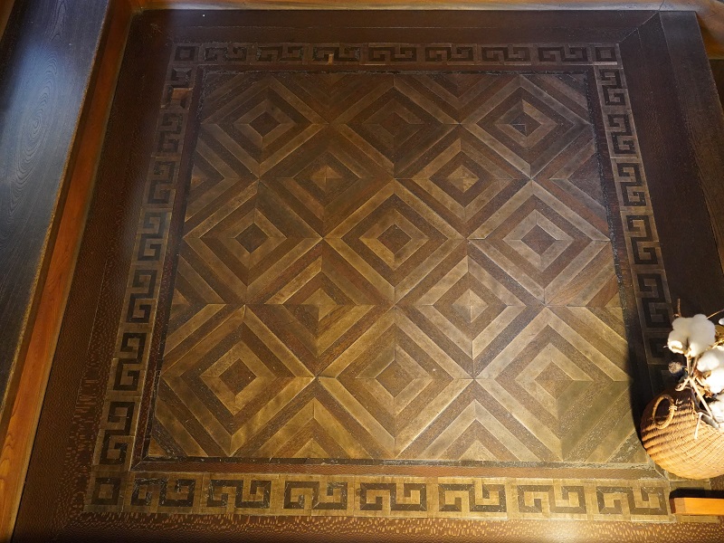 網代という編み技が施された雨戸の戸袋、昔ながらの手作りゆえのゆがみがある窓ガラスなど、廊下で歩みを進めるなかでも建築美の見どころはたくさんだが、途中に寄せ木細工の床や、近くの二見興玉神社で神の使いとされるカエル彫刻が置かれた階段を下りて1階へ。
