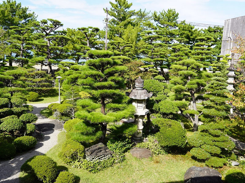 敷地の北東部に位置する庭園は、砂利道に沿って周回する回遊式になっている。実はこの庭園、2階の御殿の間からの眺めがもっともよいものであるように植栽や石の配置がされているのだとか。ぜひ御殿の間の窓辺から眺めてみてほしい。